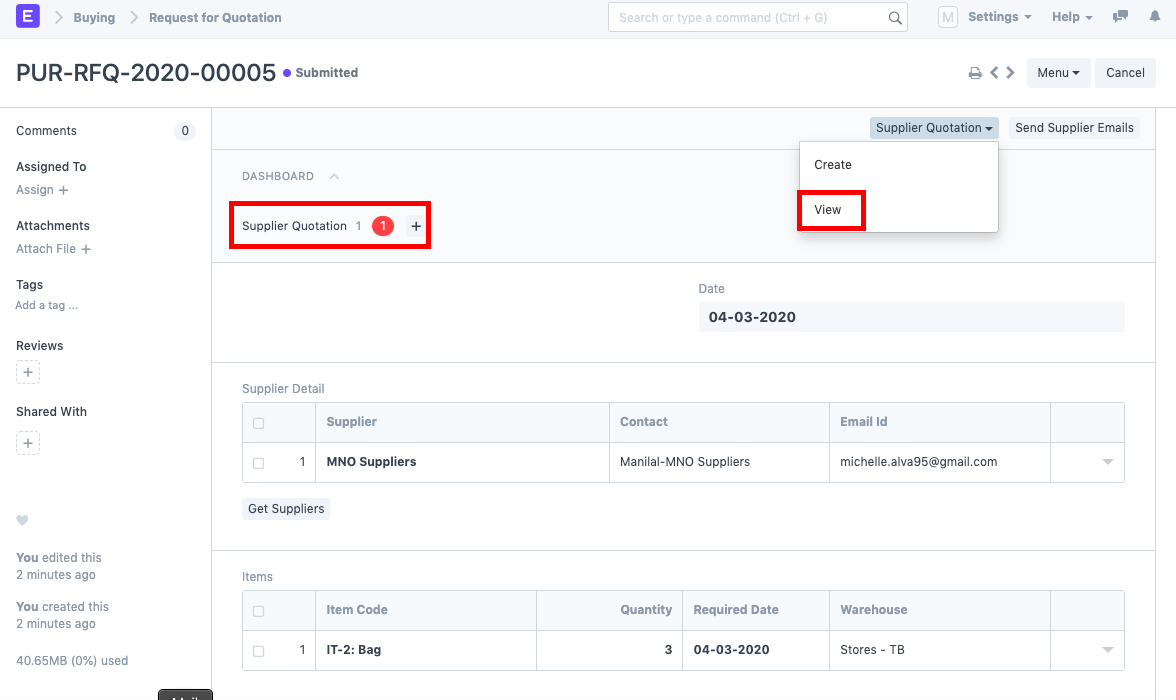 Once the RFQ is submitted, a Supplier Quotation gets automatically created in the system against this RFQ. Click on the "View" option.