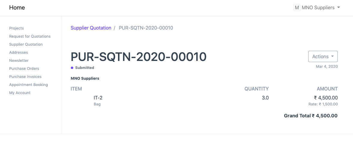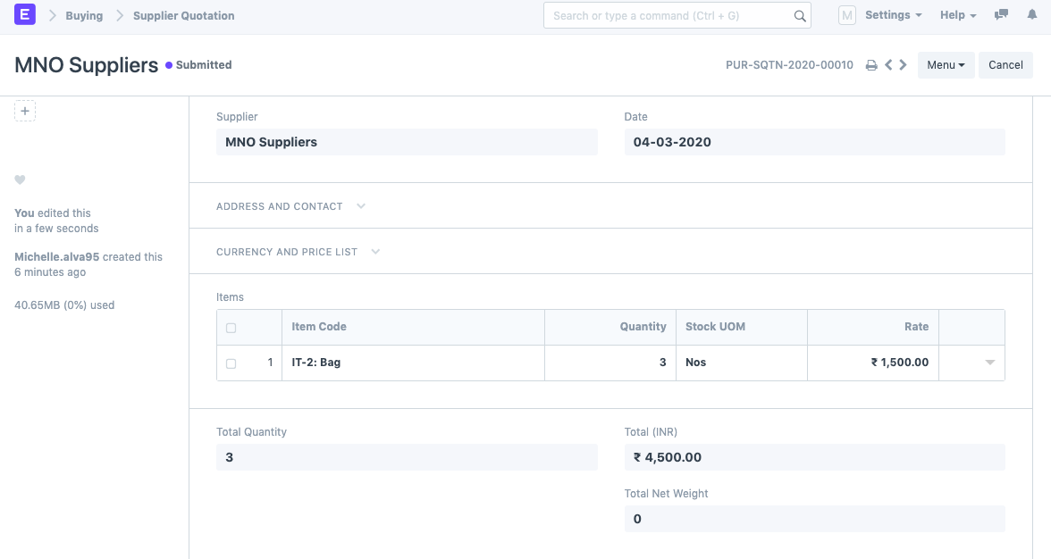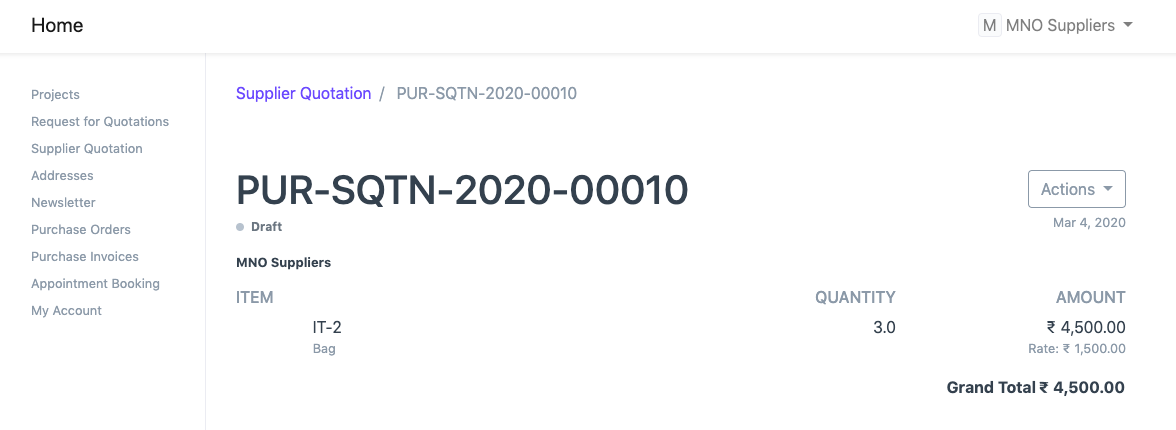 Observe that the Supplier Quotation is in the Draft state. After reviewing the Supplier Quotation, the user can submit it. This will also be reflected in the Supplier Portal.