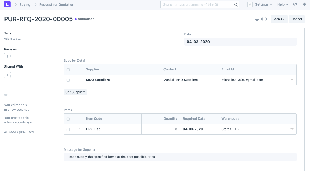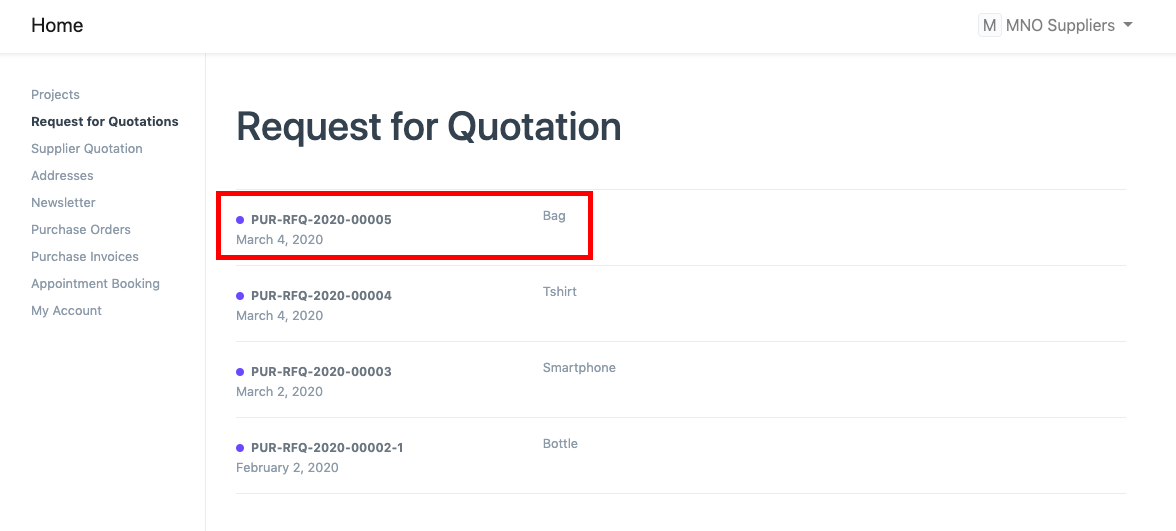 1) Create a Request for Quotation for the Supplier in the system. For example, we are creating an RFQ for "MNO Suppliers".