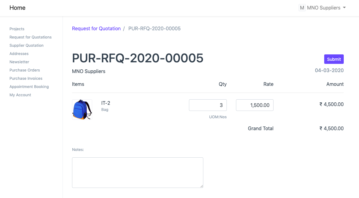 The Supplier has to enter the Item Rate and submit the RFQ.