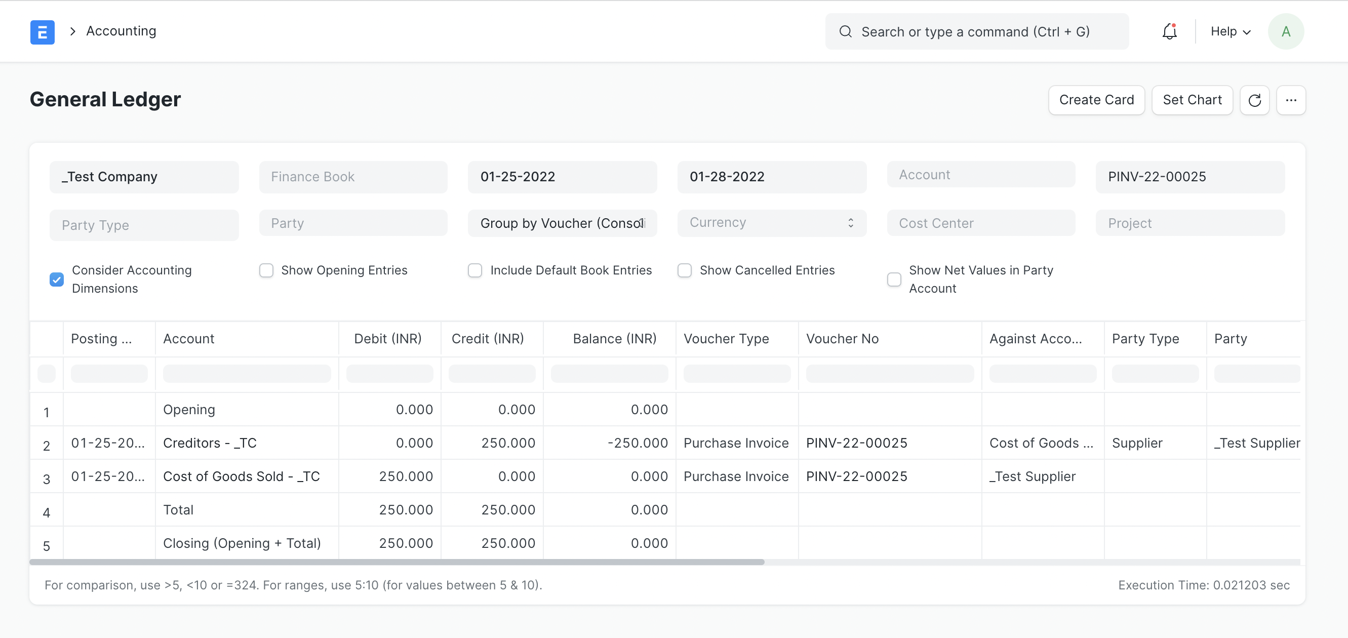 To see entries in your Purchase Invoice after you “Submit”, click on “View Ledger”.